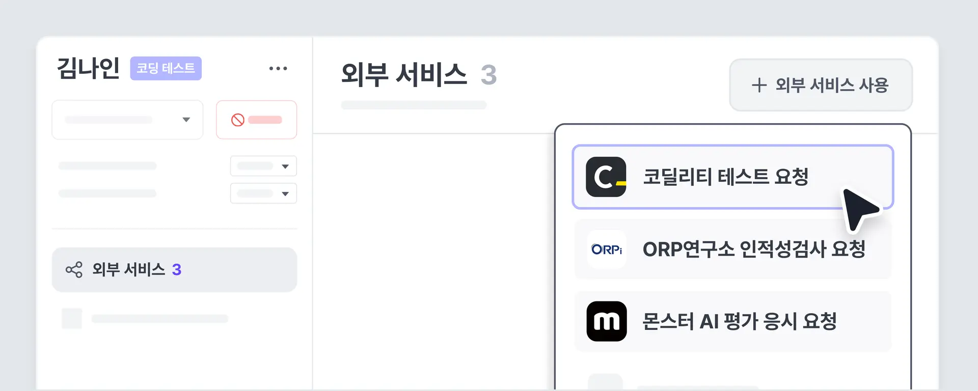 그러나 채용 관리 솔루션과 평가 도구를 연동하면, 한 곳에서 지원자에게 코딩 테스트나 인적성 검사 등의 평가 도구의 응시를 요청할 수 있고, 평가 서비스를 오가며 확인할 필요 없이 실시간으로 진행 상황을 모니터링하고 결과를 바로 확인할 수 있어 업무 효율성이 크게 향상됩니다.