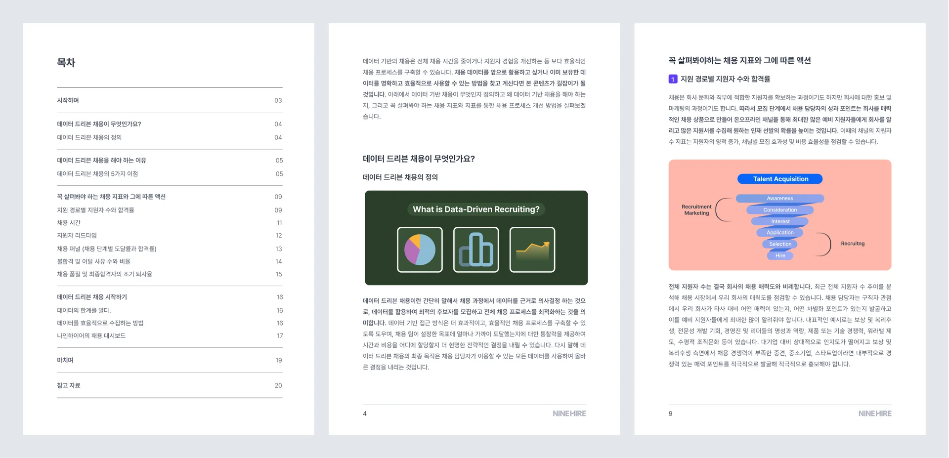 채용 데이터를 앞으로 활용하고 싶거나 이미 보유한 데이터를 명확하고 효율적으로 사용할 수 있는 방법을 찾고 계신가요? 인재를 뽑기에도 바쁜 채용팀을 위해 나인하이어가 대신 꿀정보들을 담아 콘텐츠로 제작했어요.