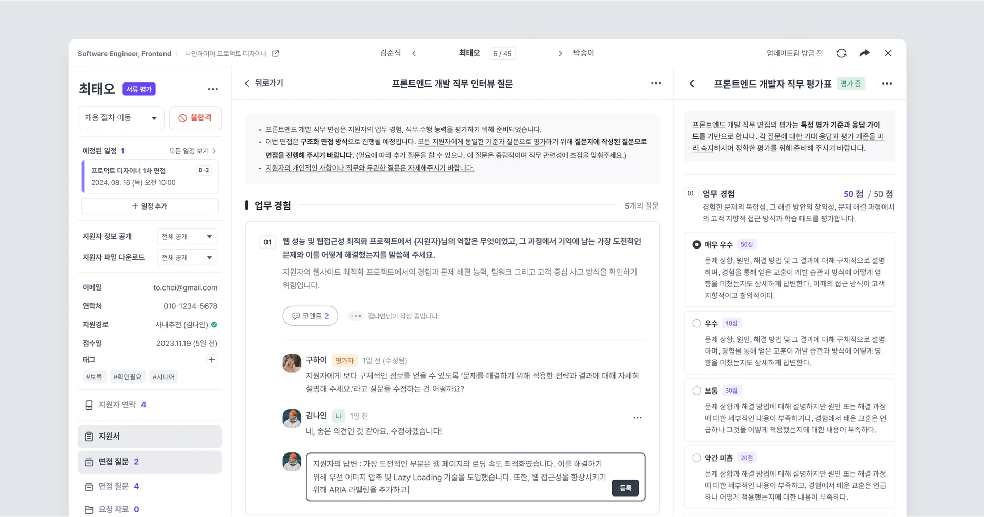 면접 점수 집계 : 지원자별로 각 면접관이 부여한 점수와 코멘트를 정리합니다.