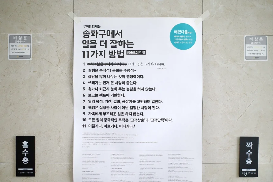 예를 들어, 우아한형제들은 '송파구에서 일을 더 잘하는 방법'이라는 구체적인 일 문화 가이드를 작성하여 사무실에 곳곳에 게시해 직원들이 공감할 수 있는 기업 문화를 조성했습니다.