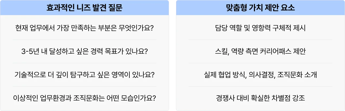 반복되는 거절 후에 마침내 대화할 기회를 잡았는데 막상 어떤 이야기를 나누어야 할지 고민이시라면? 먼저 사전에 파악한 니즈로 대화를 풀어 보세요. 예를 들어 현재 업무에 가장 만족한 부분은 무엇이고 어떤 부분이 아쉽다고 생각하는지 그리고 이직을 통해 어떻게 더 나은 방향으로 변화할 수 있을지 구체적인 가치를 제안한다면 자연스럽게 대화할 수 있을 것입니다. 만약 다른 경쟁사 대비 확실한 경쟁력이 있다면 함께 어필해 보는 것도 좋습니다.