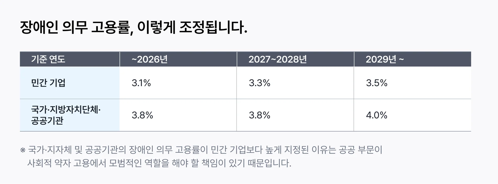 2025년 기준 민간 기업의 장애인 의무 고용률은 3.1%, 공공 부문은 3.8%입니다. 이 비율이 2027년과 2029년에 아래와 같이 단계별로 상향될 예정입니다.