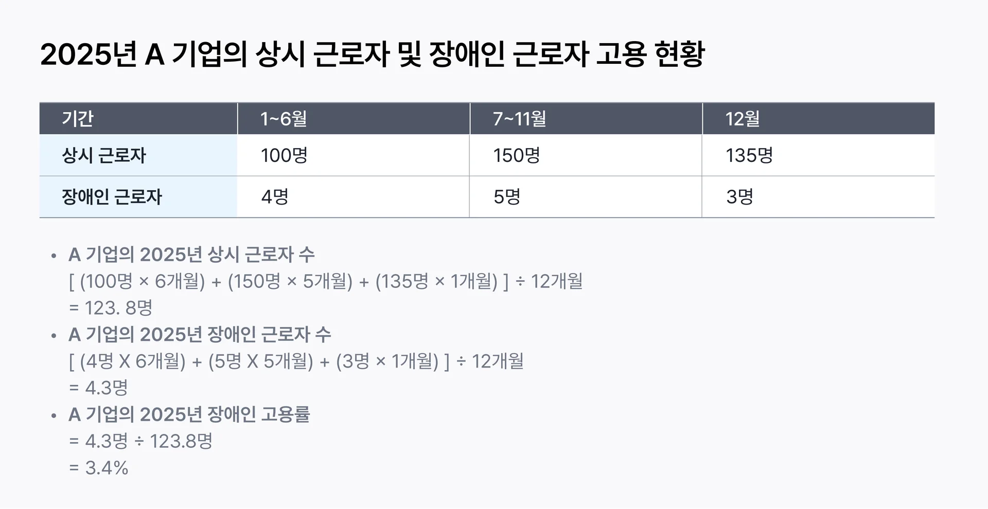 상시 근로자 수와 장애인 근로자 수는 모두 월 평균으로 계산하기 때문입니다. 많은 기업들의 근로자 수는 1년간 자주 변동합니다. 1월에는 100명, 3월에는 105명, 8월에는 95명 등등과 같이 말이죠. 또한 ‘상시’ 근로자라면 매월 16일 이상 고용한 근로자라는 조건까지 붙죠.
