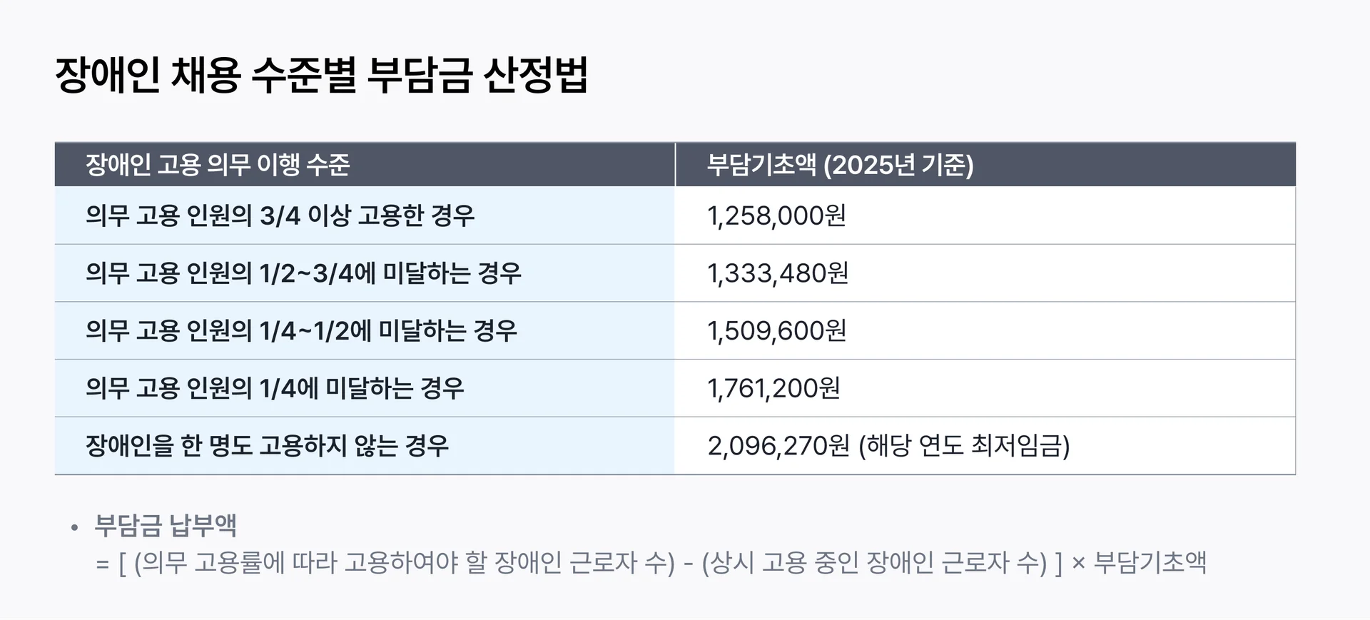부담금 기준은 의무 고용 인원을 얼마나 미달했는가에 따라 달라집니다. 장애인을 한 명도 고용하지 않았다면 부족한 인원당 약 209만 원, 의무 고용 인원을 3/4 이상 채웠으나 미달했다면 부족한 인원당 약 125만 원씩 부과하는 식이죠.