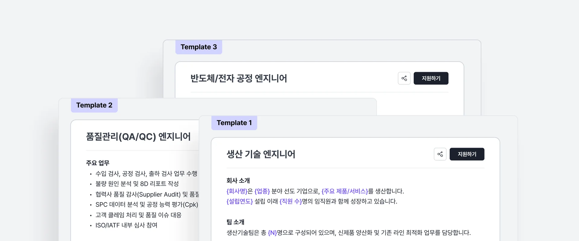 : {중괄호} 안의 정보만 채우면 바로 게시할 수 있는 직무별 템플릿이 들어있어요.