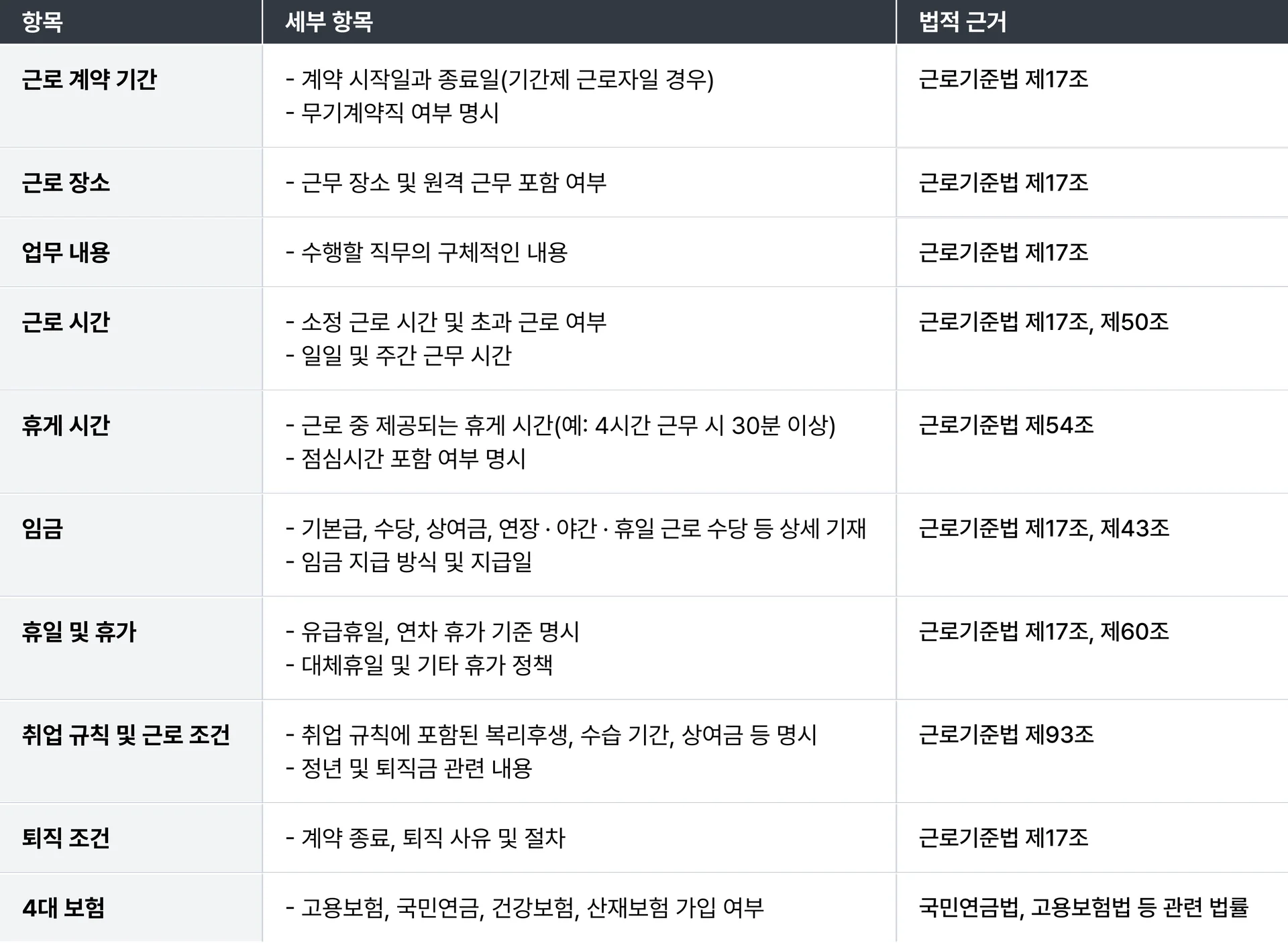 근로기준법에 근거한 '근로계약서 필수 항목'을 아래와 같이 정리할 수 있습니다. 인사 담당자님께서 근로계약서를 작성하고 준비할 때, 필수 항목이 누락되지 않도록 아래 표를 통해 점검하시기 바랍니다.