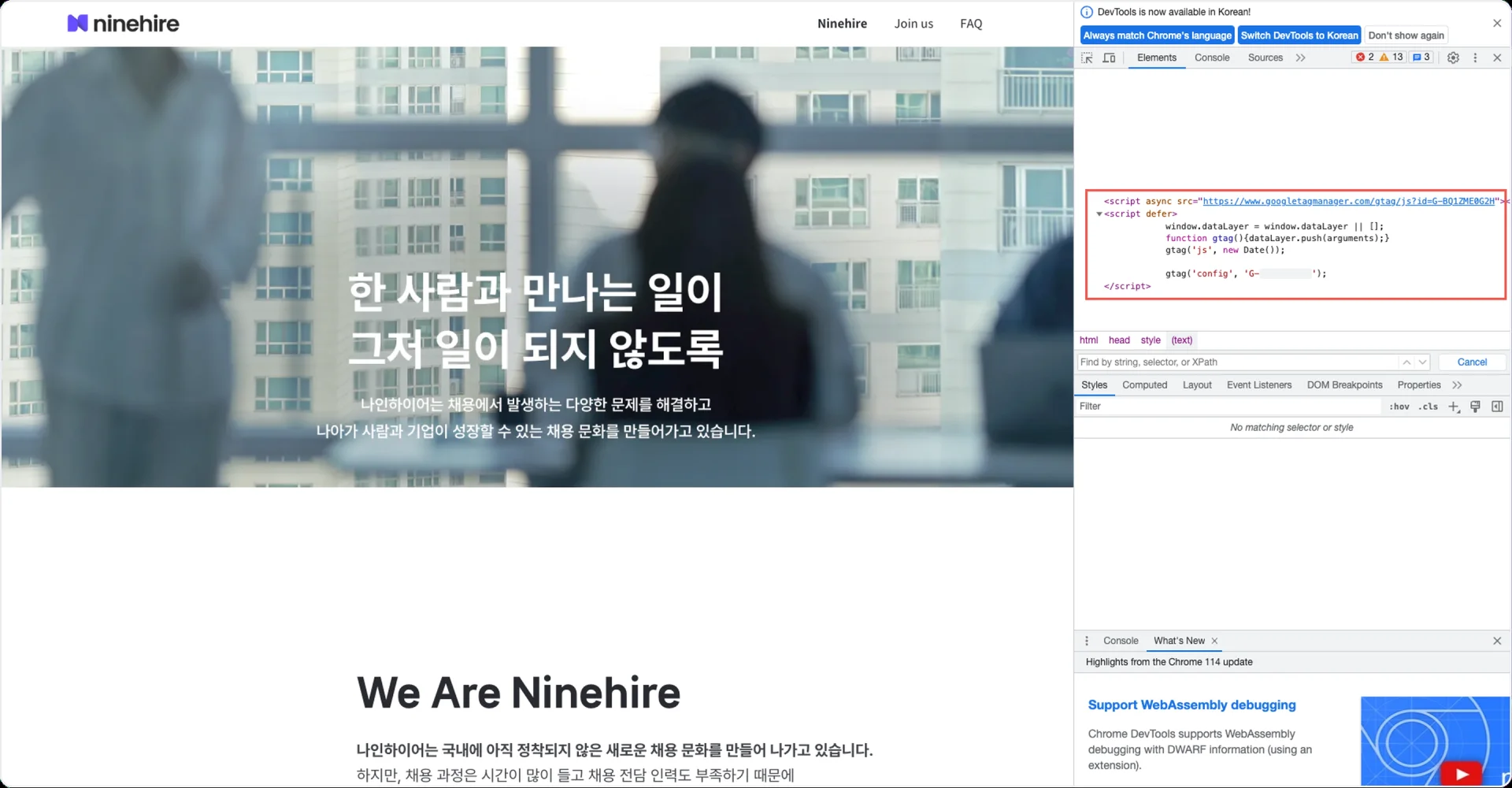 다만, 나인하이어 채용 홈페이지 빌더를 사용하고 있지 않으시다면 HTML 태그를 복사하여 채용 홈페이지 관리자에게 전달하여 채용 홈페이지의 <head> 섹션에 넣어달라고 요청해 주세요.