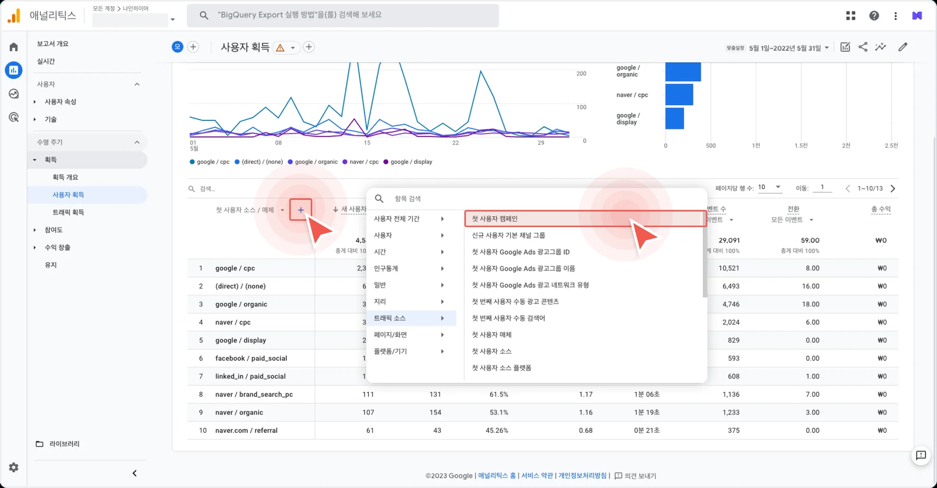 ➍ ➌번 처럼 변경하시면 아래와 같이 첫 사용자 (또는 세션) 소스/매체에 따른 새 사용자 (또는 사용자) 수를 알 수 있으며, 어느 채널에서 많이 유입되는 지 파악할 수 있습니다. 이 상태에서 캠페인, 콘텐츠를 같이 보고 싶으시다면 다음과 같이 추가하시면 됩니다.