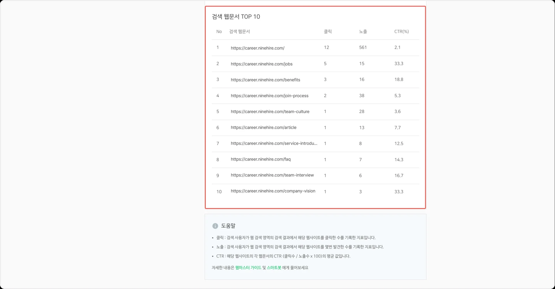 검색 웹문서 TOP 10은 잠재 후보자가 네이버 검색 결과에서 어떤 페이지로 유입되었는지를 알 수 있습니다. 우리의 핵심 페이지에 대한 노출 수가 적으신가요?