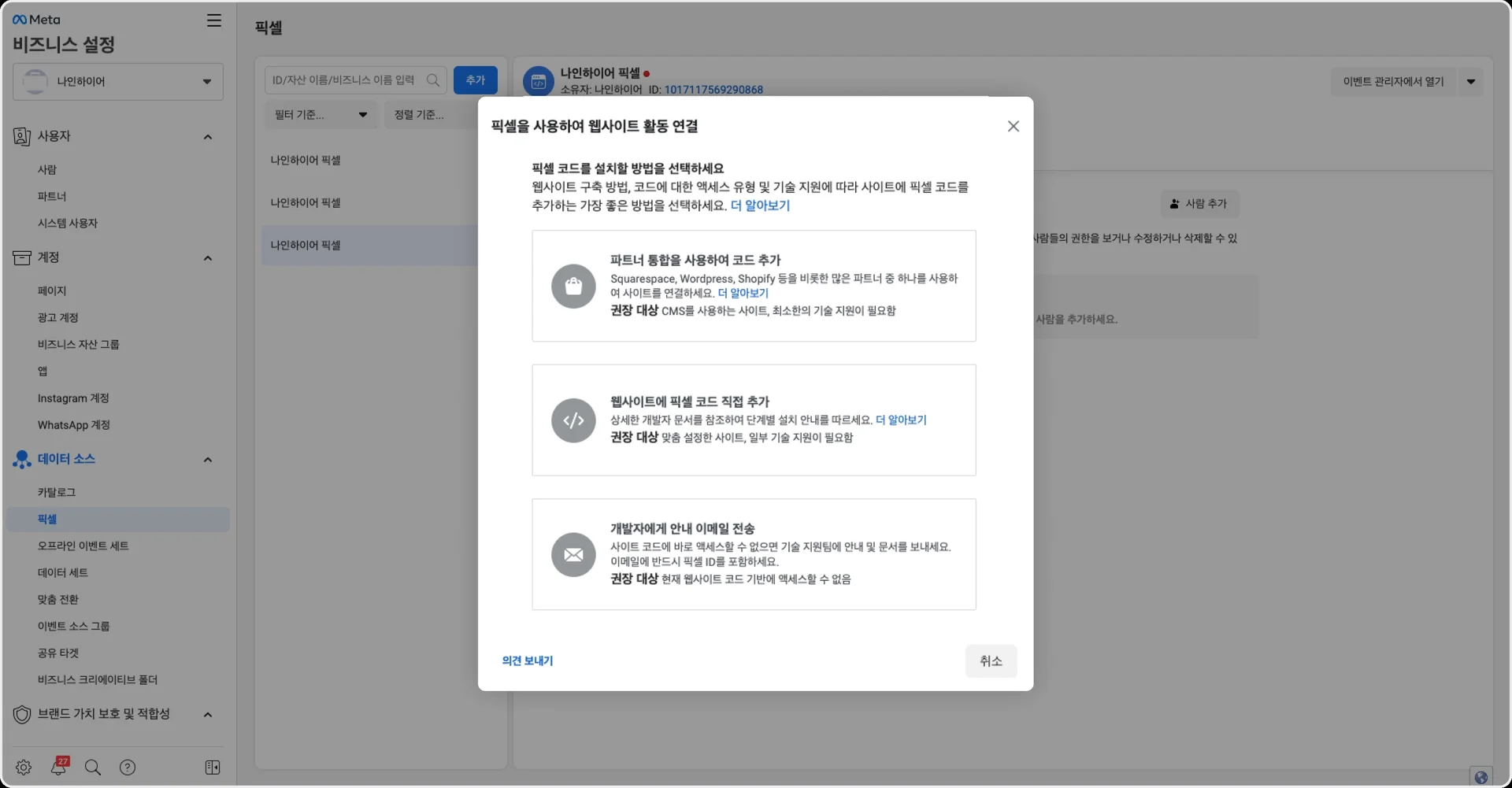 Meta 비즈니스 설정의 [데이터 소스] > [픽셀] 에서 Facebook Pixel을 추가할 수 있습니다. 추가 방법은 아래의 이미지에 상세히 설명되어져 있습니다.