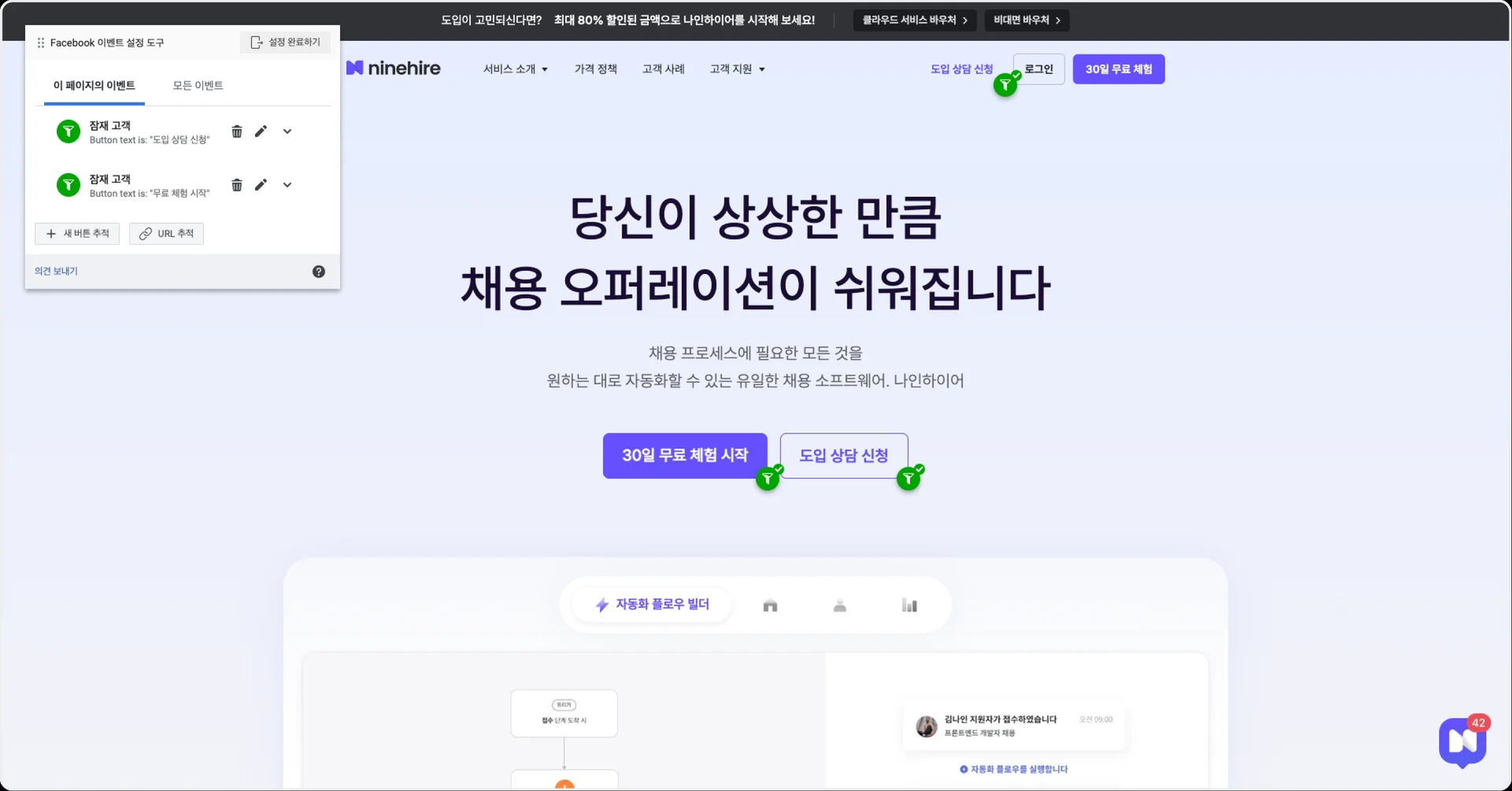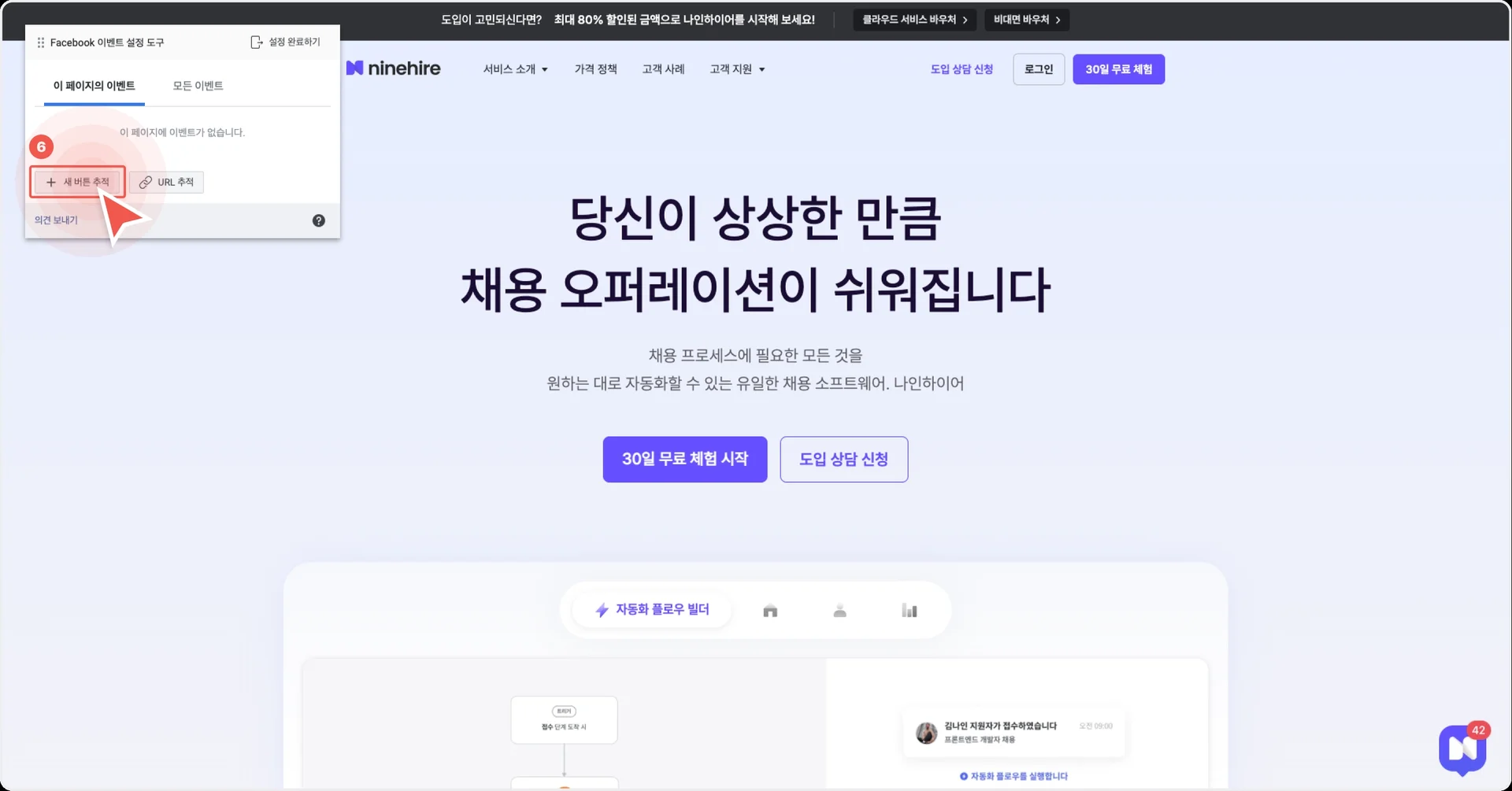 이벤트 생성 방법에 대해 친절히 알려 드리기 위해 나인하이어 랜딩페이지를 기준으로 이벤트를 생성하는 방법을 알려 드리겠습니다.