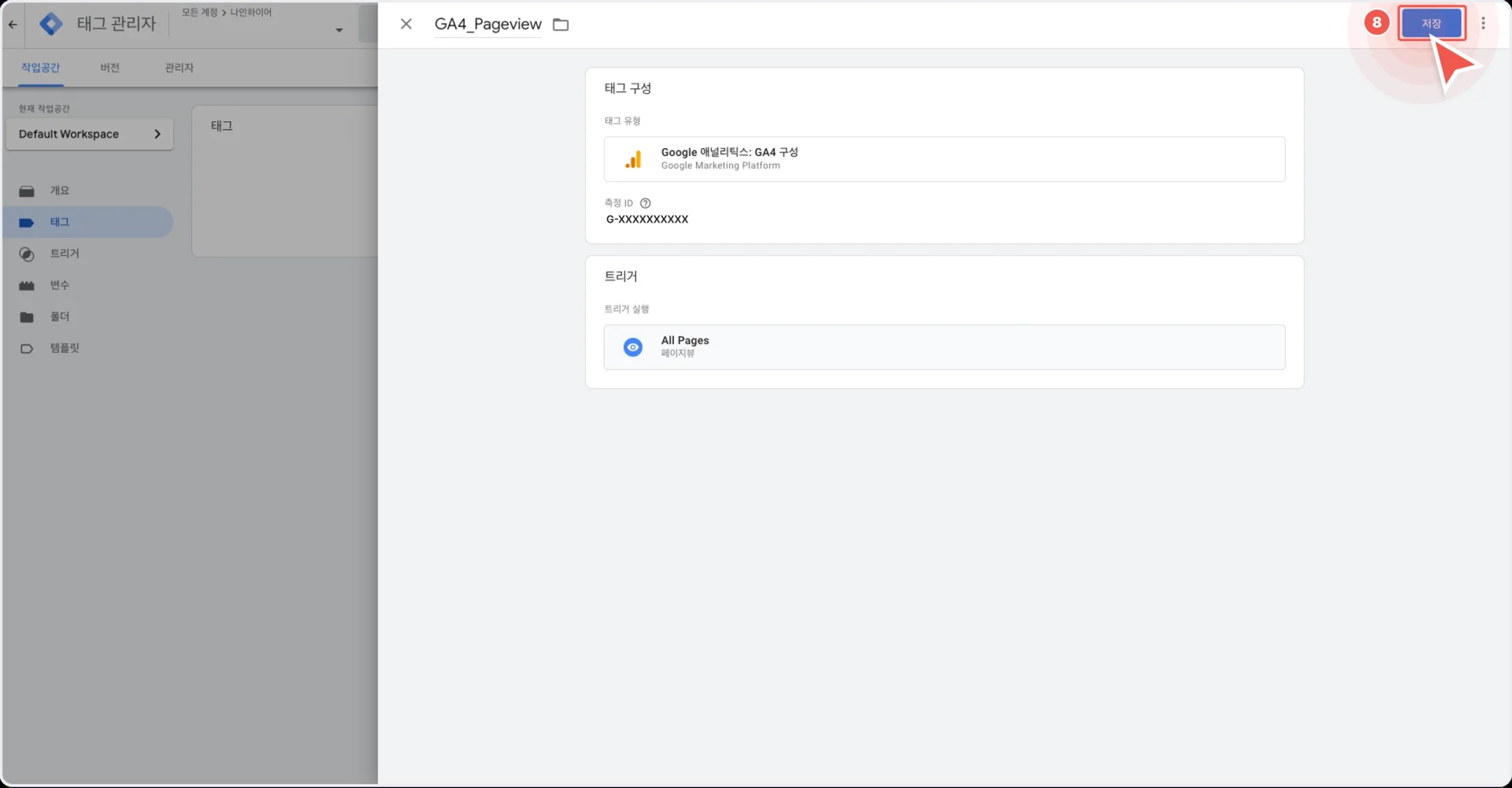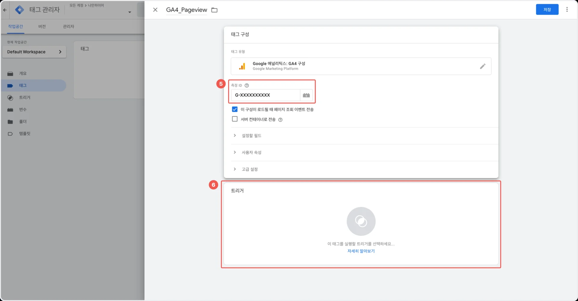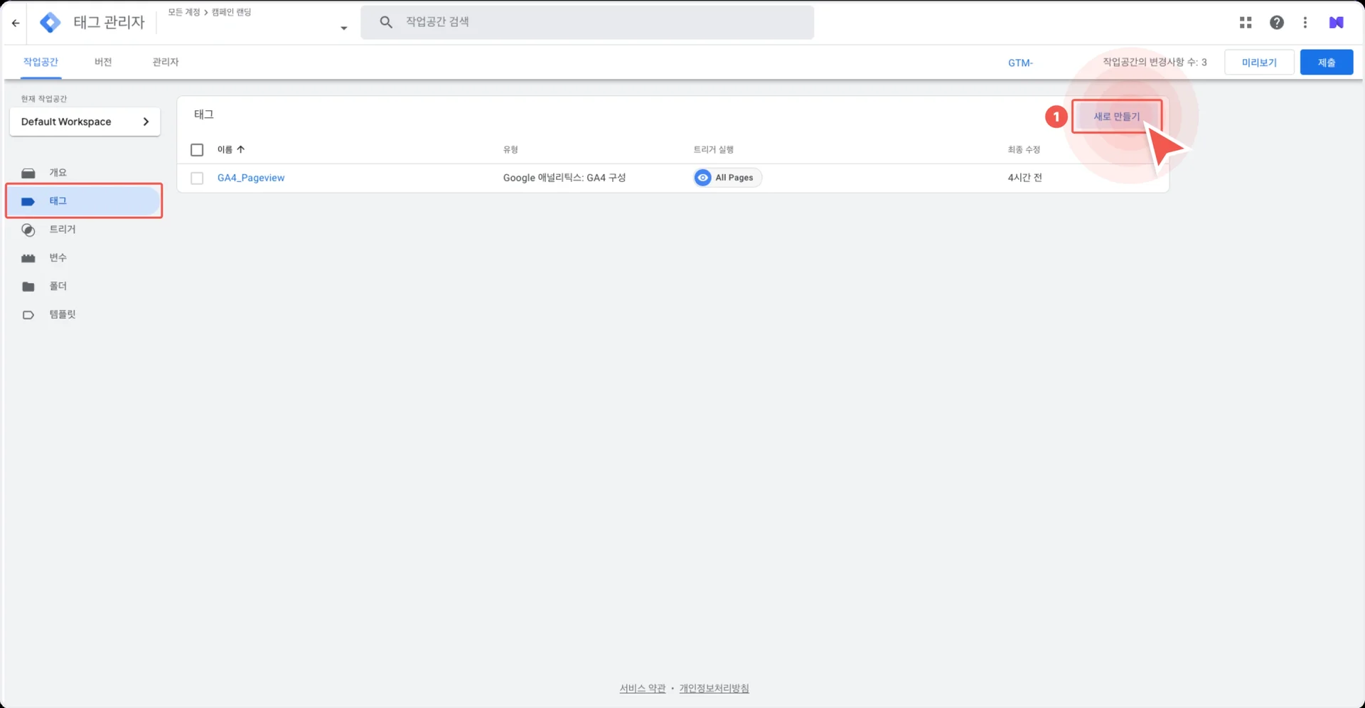 GTM을 통해 추적한 이벤트에 대한 데이터 지표는 Google Analytics에서 확인할 수 있습니다. 이를 위해서는 GTM과 GA와 연결하셔야 합니다. ‘GA4_Pageview’라는 태그를 만들어 봅시다.