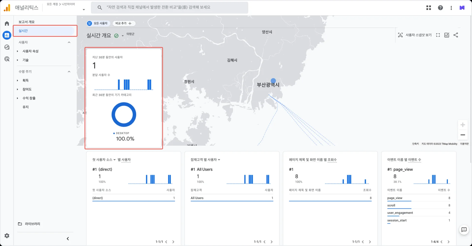 ‘GA4_Pageview’ 태그 설치가 완료되었습니다. 설치가 정상적으로 완료되었다면, GA의 실시간 보고서에서 데이터가 수집되는 것을 확인할 수 있습니다.
