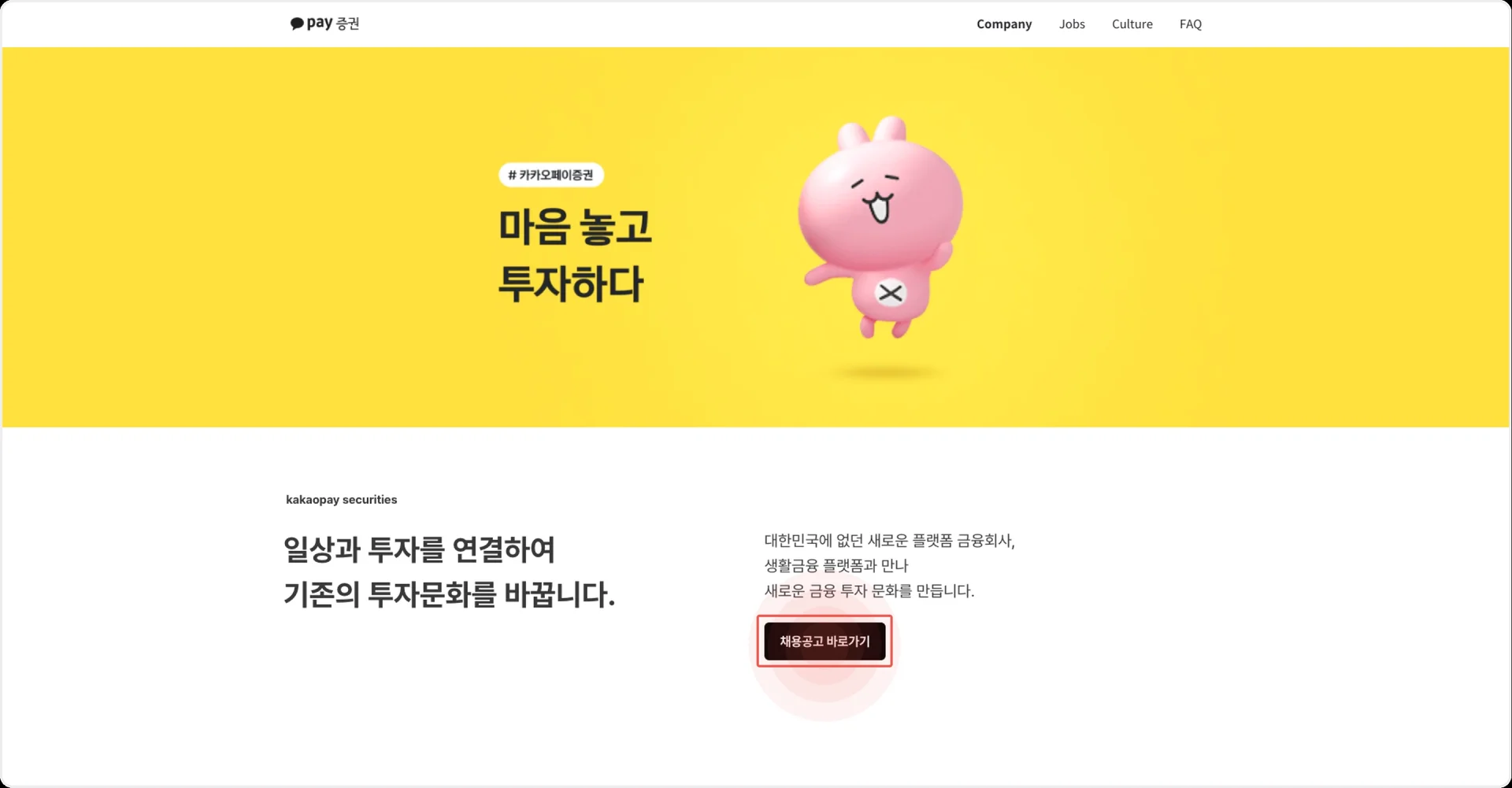 실제 나인하이어 채용 홈페이지 빌더로 제작된 카카오페이증권 채용 홈페이지를 예로 들어 이벤트 데이터 수집 방법에 대해 설명해 드리겠습니다. 카카오페이증권 채용 홈페이지 상단에 위치한 채용공고 바로가기 버튼의 목적은 사용자가 채용 공고 목록에 쉽게 접근하기 위함일텐데요.
