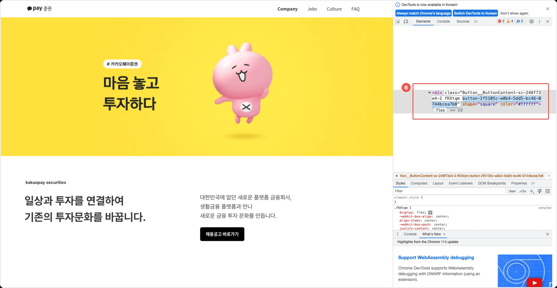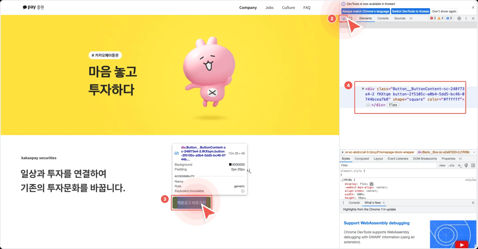 아래의 이미지처럼 진행하면 버튼에 대한 HTML 코드가 하이라이트 되어 보입니다. 카카오페이증권 채용 홈페이지의 채용공고 바로가기 버튼의 HTML 코드 앞부분에는 <a> 태그가 보이지 않습니다. 이는 클릭 - 모든 요소 트리거 유형을 선택해야 함을 의미합니다.