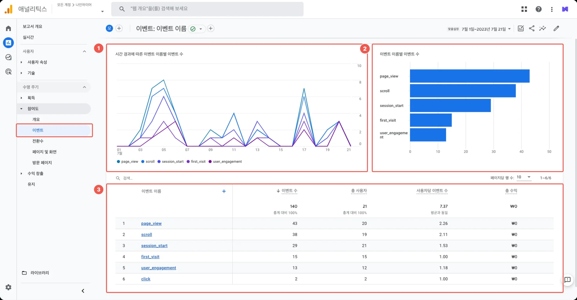 이벤트 이름별 이벤트 수, 총 사용자, 사용자당 이벤트 수를 기반으로 성과를 파악할 수 있습니다.