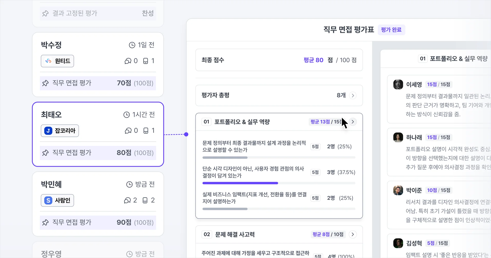 합격자와 탈락자의 평가 데이터가 누적되면 우리 조직에 실제로 잘 맞는 인재의 패턴을 파악할 수 있고, 채용할수록 선발의 정확도가 높아집니다. 결과적으로 잘못된 채용으로 인한 재채용 비용, 온보딩 낭비, 조직 내 혼란을 사전에 줄일 수 있습니다.
