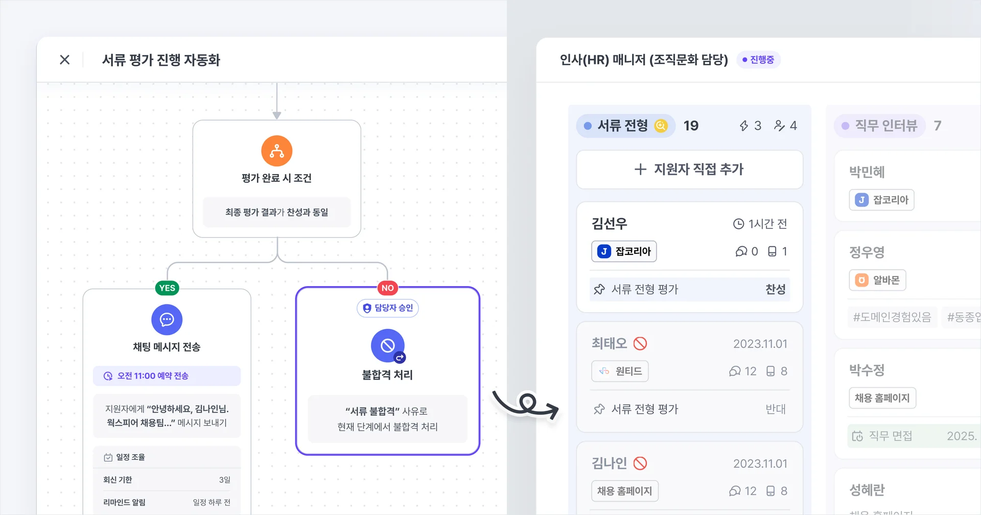 알림만 자동화되고 실제 처리는 여전히 담당자가 직접 해야 한다면, 채용 프로세스의 핵심적인 수작업은 그대로 남게 됩니다.