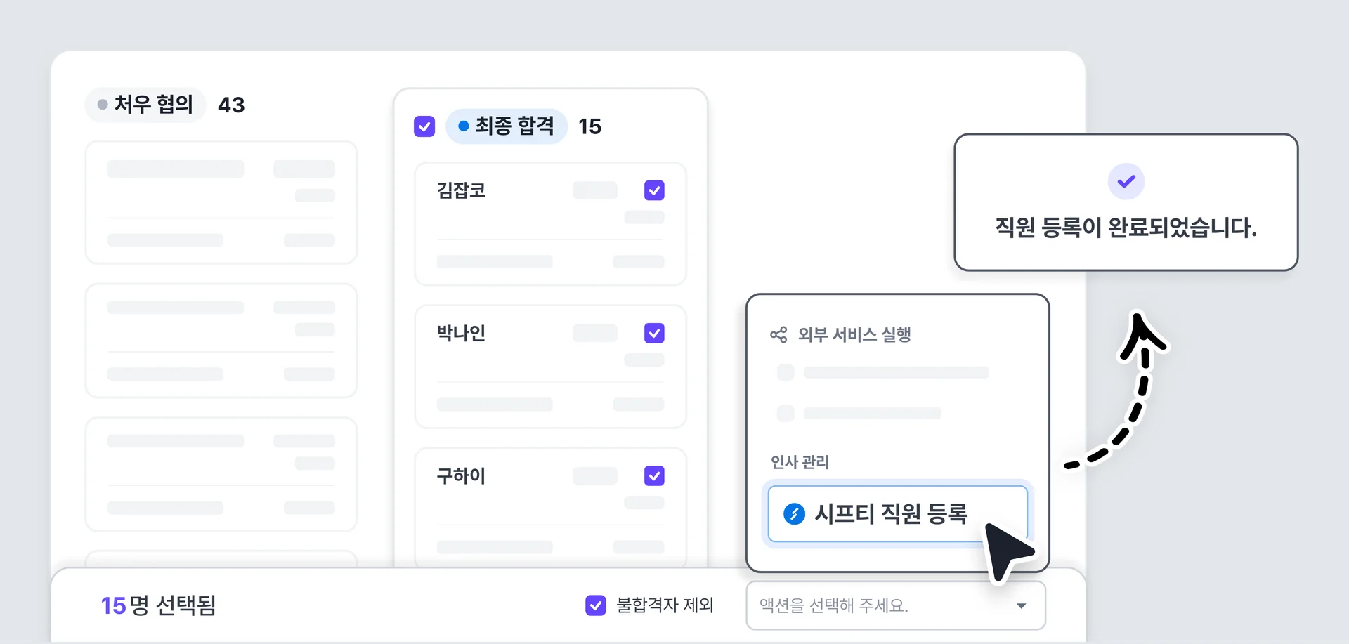 합격자 정보를 직원 관리 시스템에 수작업으로 입력하느라 시간을 낭비한 경험이 있으신가요? 채용 관리 솔루션과 인사 관리 솔루션을 연동하면, 합격자 정보를 손쉽게 직원 관리 시스템에 연동할 수 있어 번거로운 과정을 줄일 수 있습니다. 더불어, 합격자에게 인사 관리 솔루션 초대 코드를 자동으로 발송하여 합류 과정이 더욱 빠르고 효율적인 진행이 가능합니다.