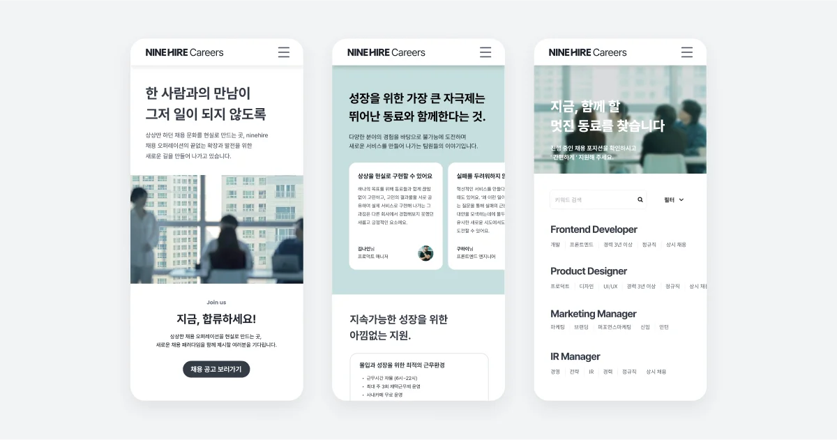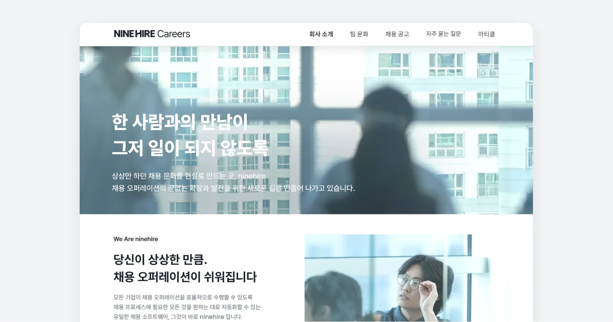 채용 관리 솔루션(ATS) 나인하이어는 지원자들이 회사를 인식하는 과정에서 효과적인 경로를 구축하는 도구로 활용할 수 있습니다.