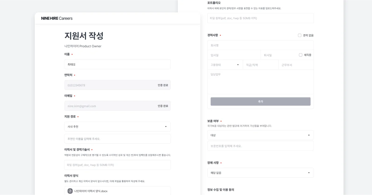 채용 관리 솔루션(ATS) 나인하이어는 지원하는 과정에서의 편의성을 높이기 위한 도구로 활용할 수 있습니다.