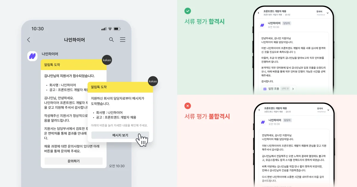 지원서가 제출되는 즉시, 나인하이어는 지원자에게 접수 확인 메일과 카카오 알림톡을 자동으로 발송합니다. 이를 통해 지원자는 자신의 지원이 정상적으로 처리되었음을 확인할 수 있습니다.