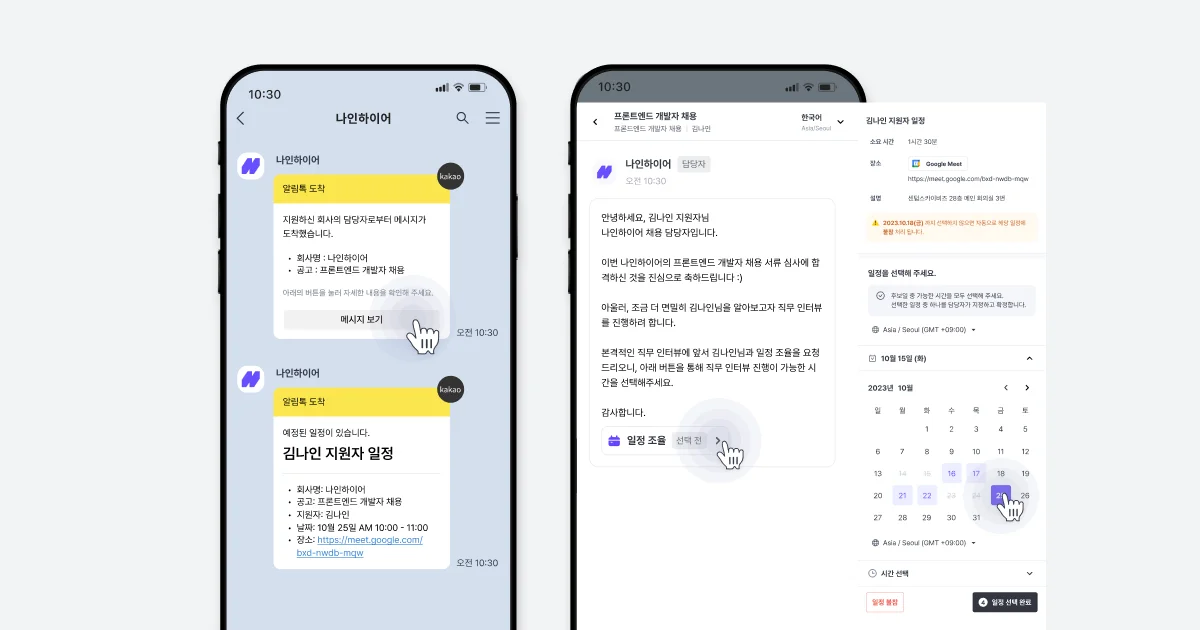 나인하이어는 카카오 알림톡을 이용하여 면접 일정을 제안하며, 지원자가 원하는 면접 후보일을 직접 선택하여 회사와 일정을 조율할 수 있는 방식을 지원합니다. 이를 통해 지원자는 회사의 세심한 배려를 직접 느낄 수 있으며, 중복되는 일정이나 번거로운 조율 없이 원활하게 면접 날짜를 확정할 수 있습니다.
