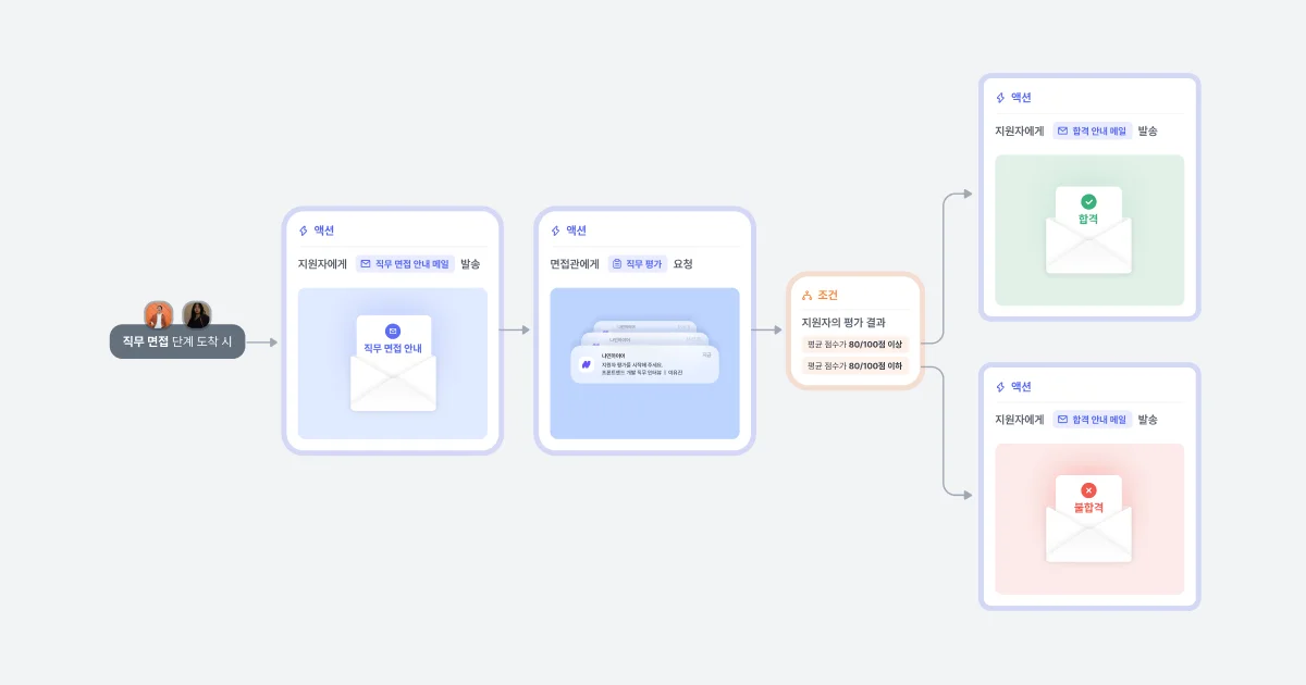 또한, 평가 결과에 따라 사전에 설정된 합격 또는 불합격 메일을 자동으로 전송함으로써, 지원자에게 적시에 결과를 안내할 수 있습니다. 이러한 과정은 지원자의 대기 시간 동안의 불안감을 줄이며, 모든 지원자를 배려하는, 지원자 중심의 회사의 이미지를 구축하는 데 기여합니다.