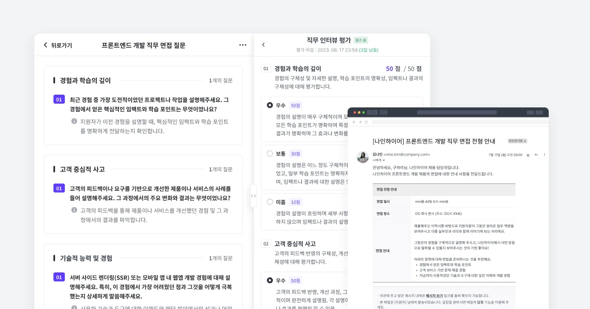 나인하이어는 각 채용 단계별로 적절한 전형 및 평가 결과 안내 메일을 지원자의 상황에 맞춰 적시에 자동 발송할 수 있습니다. 또한, 자동화된 평가 요청 및 결과 취합 기능은 선발 과정의 속도를 높여 지원자에게 더욱 신속하고 원활한 면접 경험을 제공할 수 있습니다. 이는 지원자의 기다리는 시간을 줄이고, 그로 인해 발생할 수 있는 선발 과정 중 이탈을 방지해줍니다.