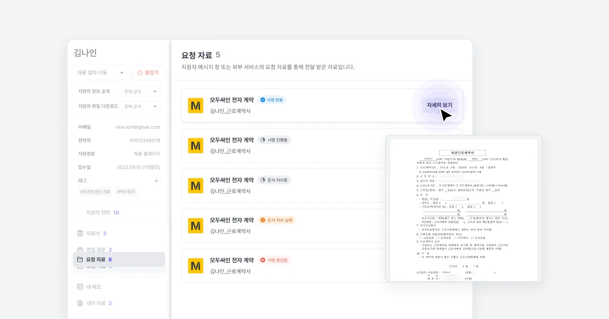 나인하이어는 지원자와의 계약 과정을 간편화하기 위해 전자 서명 서비스와의 연동을 지원합니다. 이를 활용하면, 지원자는 간단한 단계로 근로계약서에 서명할 수 있으며, 회사도 근로 계약 과정과 문서를 효율적으로 관리할 수 있습니다.
